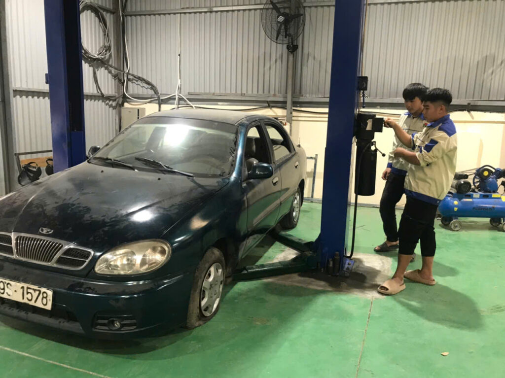 Dưới sự hướng dẫn trực tiếp của giáo viên chuyên ngành, các em được tiếp cận và thao tác trên cầu nâng hai trụ, thực hành kiểm tra: