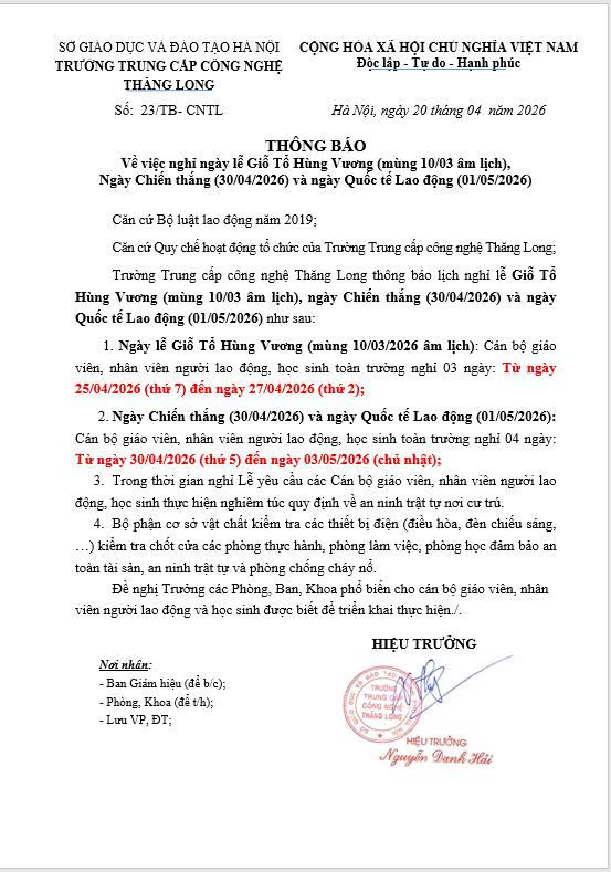 Trường Trung cấp Công nghệ Thăng Long kính chúc Quý phụ huynh, các em học sinh – sinh viên cùng toàn thể cán bộ, giáo viên có một kỳ nghỉ lễ thật vui vẻ, an toàn và ý nghĩa bên gia đình.